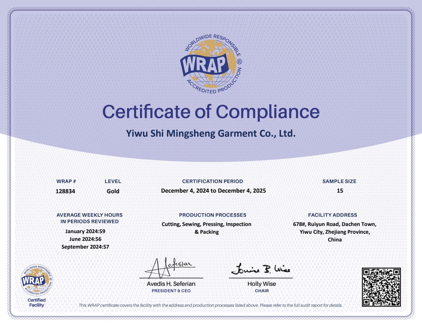 Our factory has obtained WRAP certification and multiple international audits. It is a 40,000-square-meter intelligent factory equipped with high-end equipment, with an annual production capacity of 1.5 million pieces of clothing. With over 30 years of professional experience and a track record of serving more than 200 international brands, we guarantee top-notch quality and high efficiency, making us a reliable partner in the global clothing supply chain.